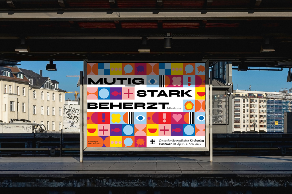 Unser Entwurf "Vielfalt" zeigt Mut zur Offenheit – mit Symbolen, die für das bunte, diverse Miteinander stehen, das den Kirchentag prägt.