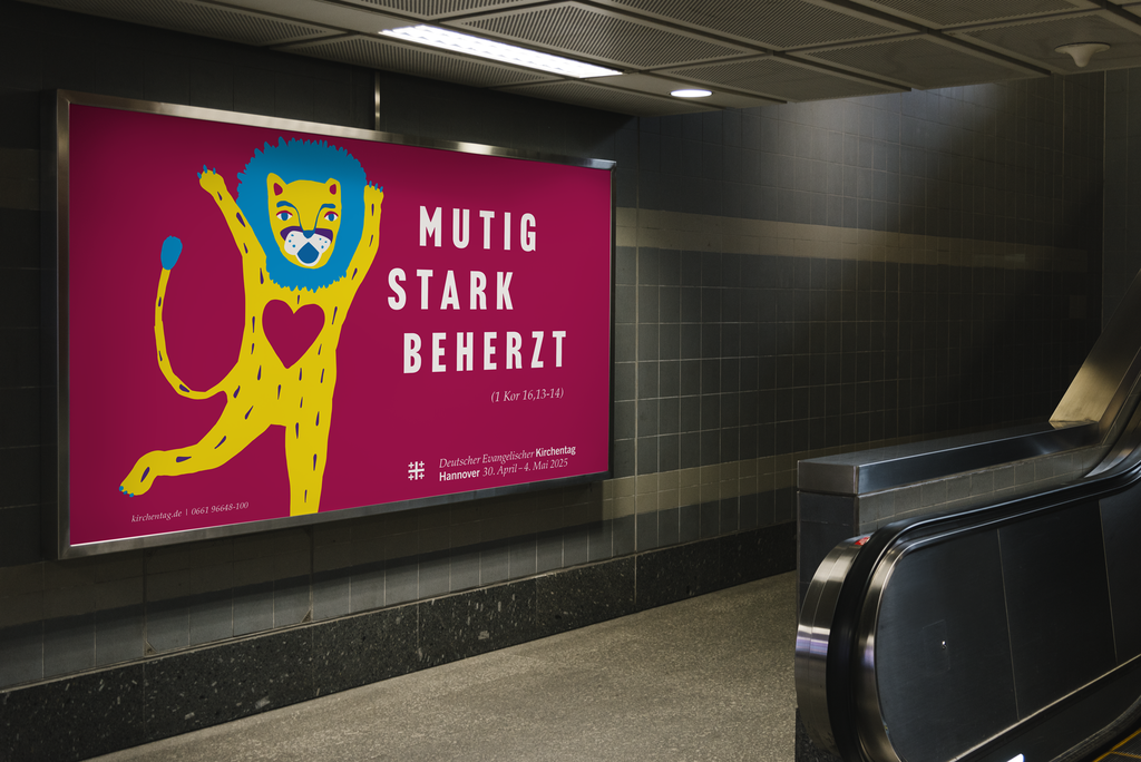 Unser Löwe "Hanno" im Kampagnenentwurf zum Kirchentag2025 in Hannover mit der Losung „mutig – stark – beherzt“.